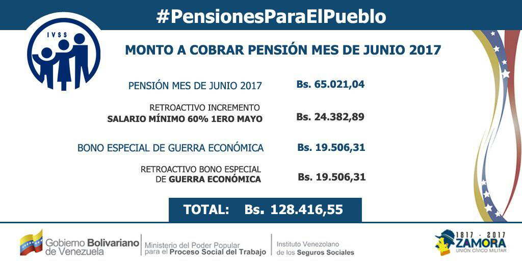 La cuenta es la siguiente: Pension mes de Junio 2014: Bs. 65.021,04 Retroactivo Incremento ( Salario minimo 60% 1ero mayo): Bs. 24.382,89 Bono especial Guerra Económica: Bs.19.506,31 Retroactivo Bono Especial de Guerra Económica: Bs.19.506,31